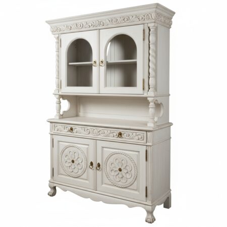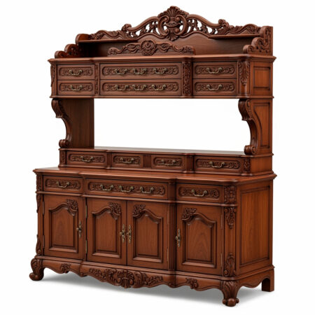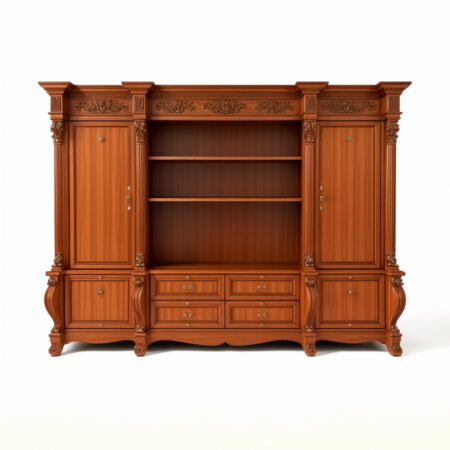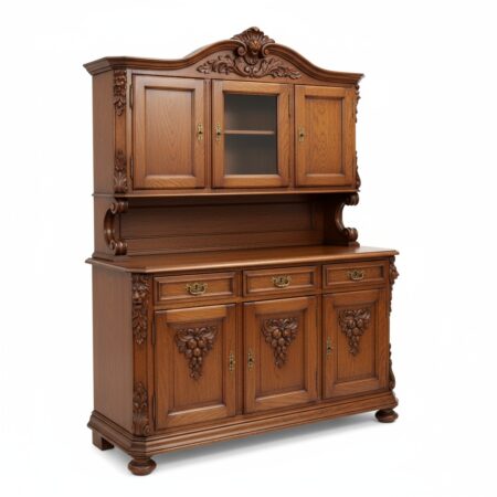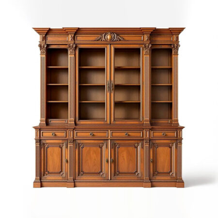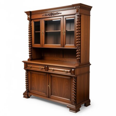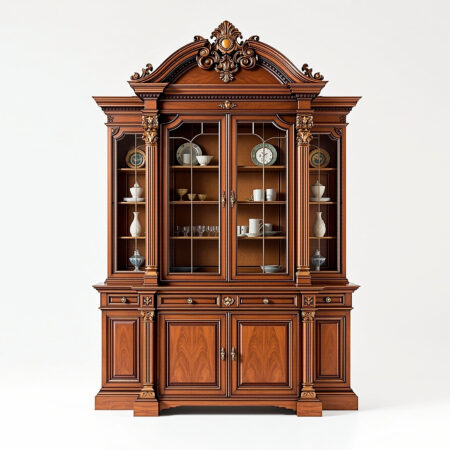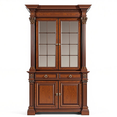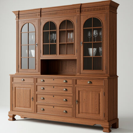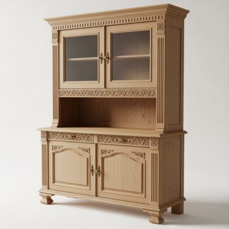 Буфеты, витрины и высокие системы хранения из массива карагача и дуба с тёплой отделкой и спокойной архитектурой фасадов.